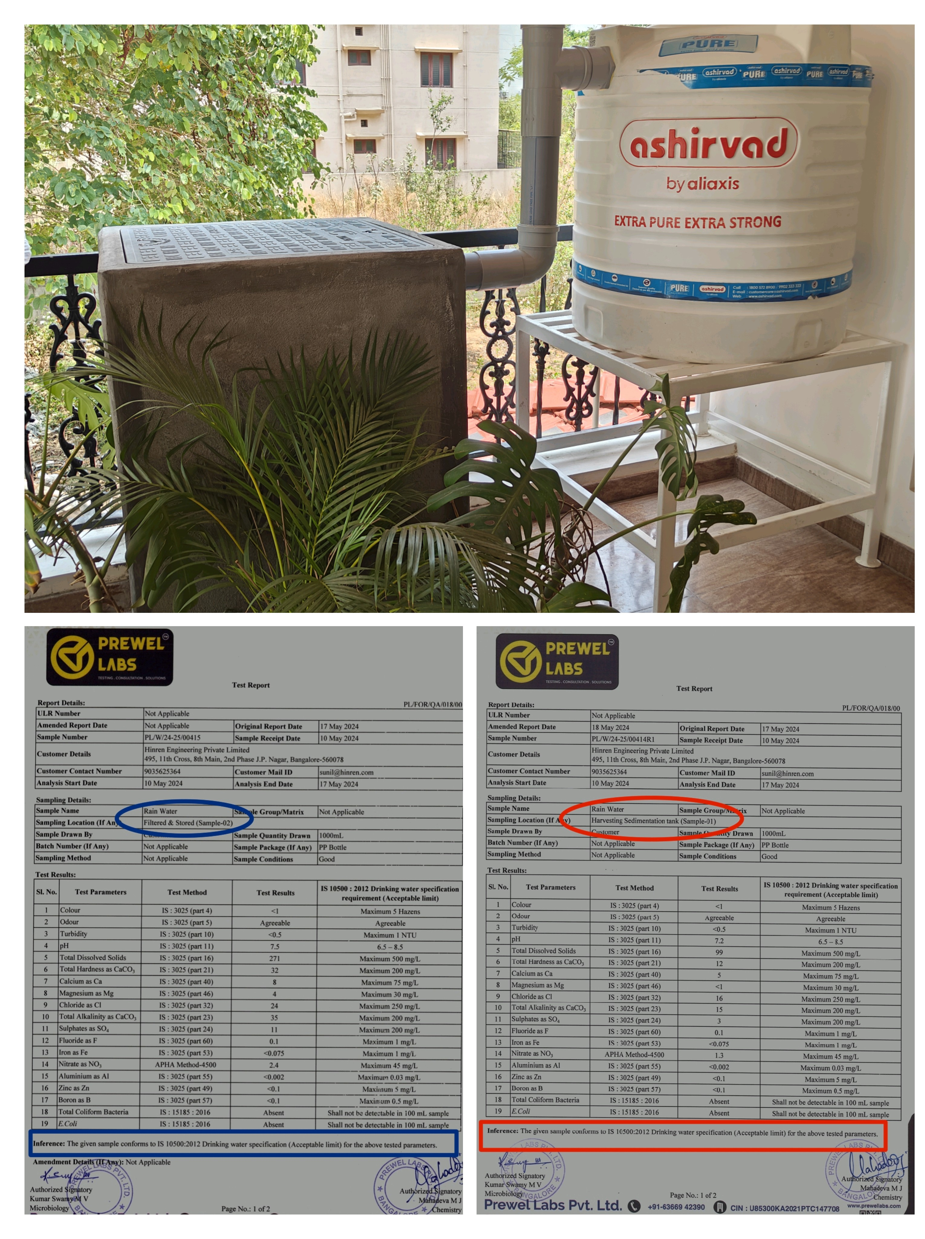 To drive home this point, I keep testing water samples collected from sedimentation and filtration tanks very regularly. As can be seen, both are potable . This is the test report from the rains in the second week of May 2024.