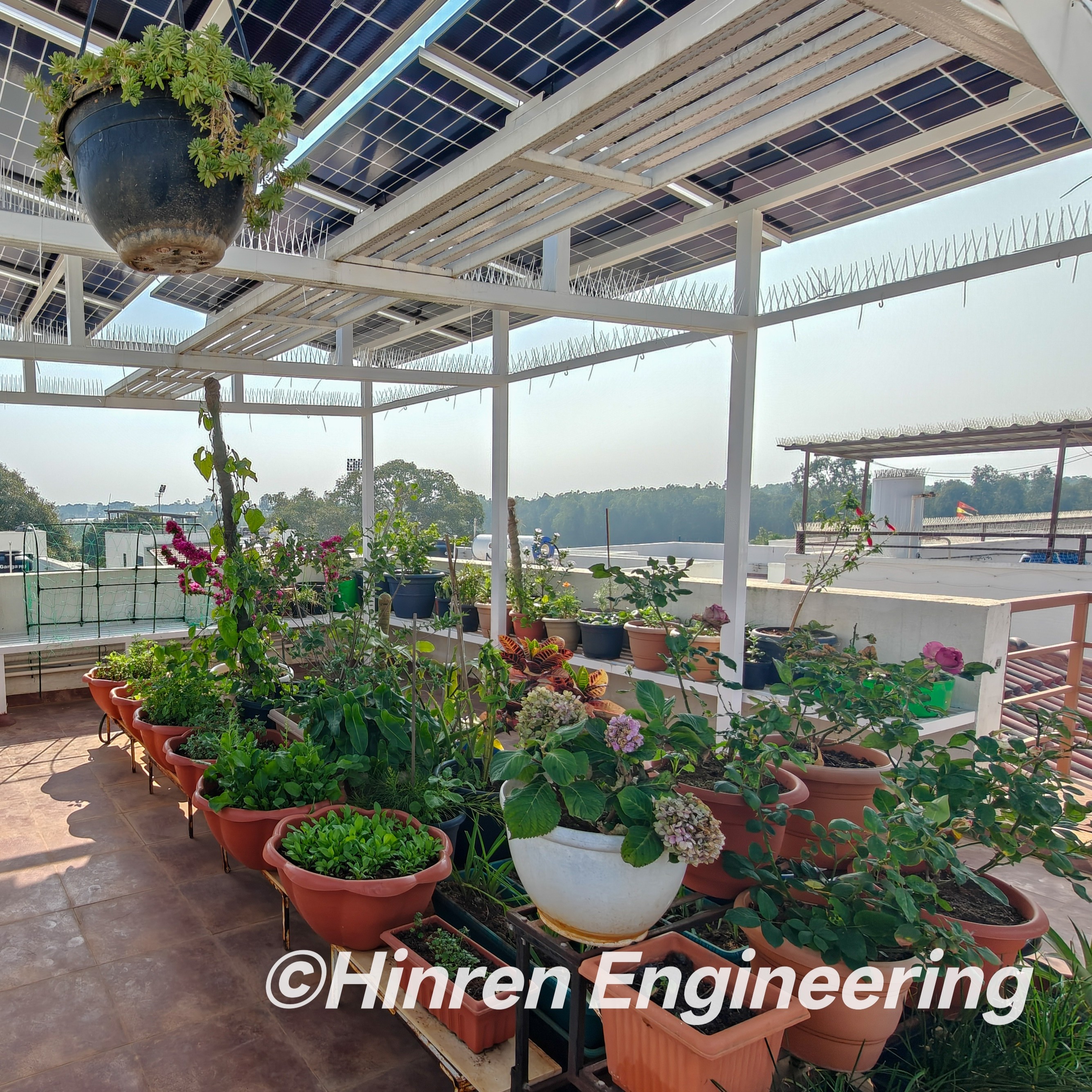 Walkways and optimized panel spacing permit filtered sunlight to reach the roof surface, preventing complete shading. The resulting microclimate—characterized by moderated temperatures and slightly higher humidity beneath the panels—when combined with bushy or foliage crops, is well suited for growing leafy vegetables and shade-tolerant plants, particularly in hot urban environments.