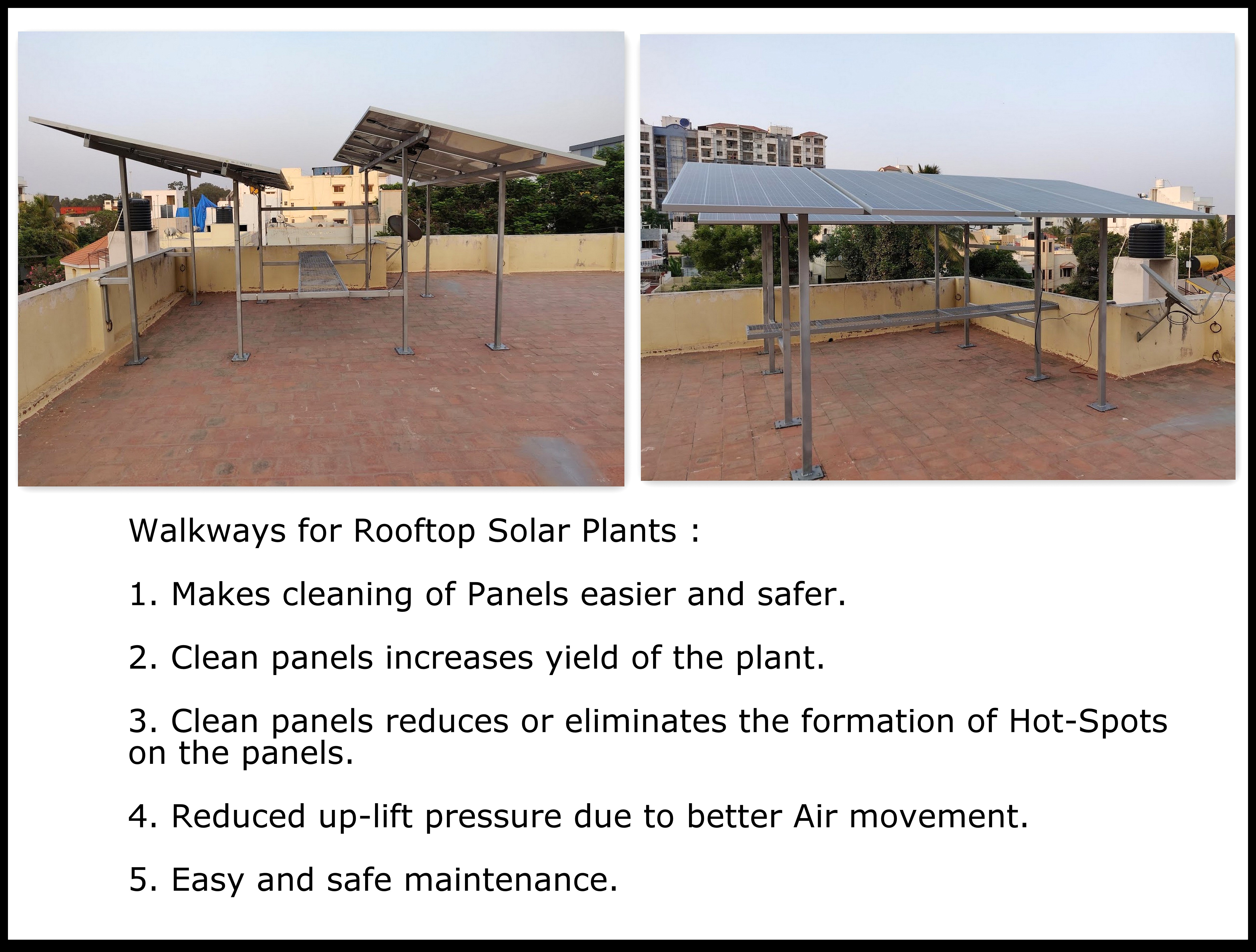 Walkways help not only in keeping the panels clean but also helps in preventive maintenance, repairs and replacement.